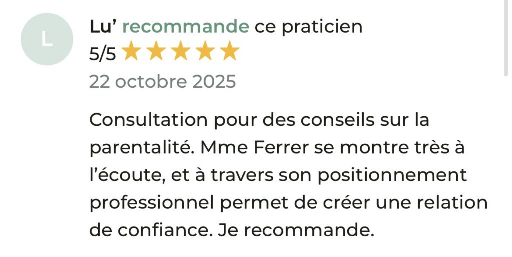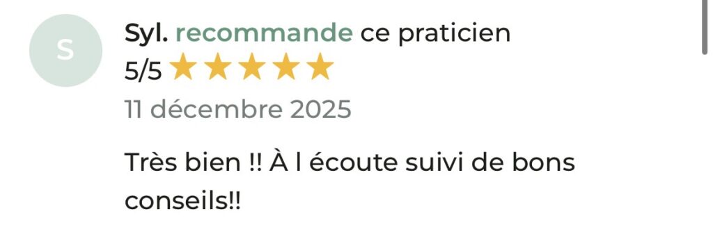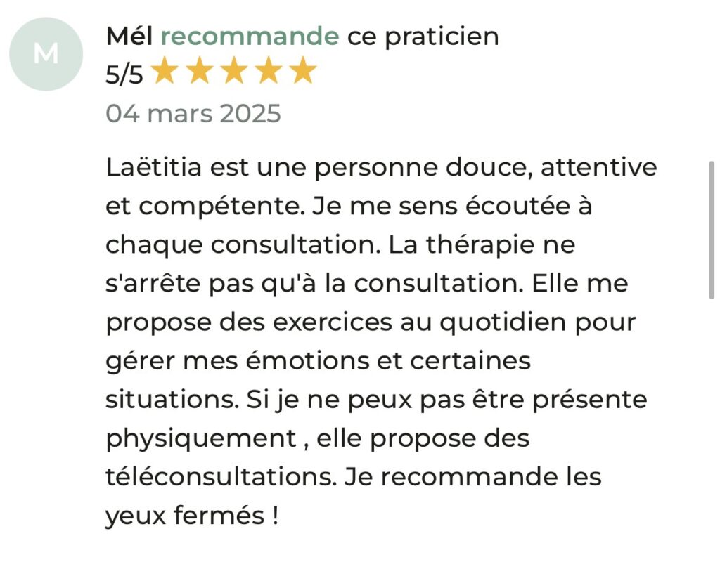 Publié sur Fanny BravoTrustindex vérifie que la source originale de l'avis est Google. Laëtitia est une femme douce et rayonnante, avec une grande et belle capacité d'écoute. Sa bienveillance pose tout de suite un cadre à la fois doux et sécurisant, on se sent rapidement en confiance et on se livre naturellement. Laëtitia est une personne très intuitive. Elle a diverses cordes a son arc pour accompagner, et ses guidances en cartomancie sont très pertinentes et sont un réel outils de progression. Bluffant ! Une personne qui n'entre pas dans les cases des standards et je trouve cela génial ! Elle nous invite par sa posture à assumer pleinement ce que nous sommes. Merci pour tout 🙏🏼.Publié sur Madison DuboisTrustindex vérifie que la source originale de l'avis est Google. Ça fait un mois que j’ai commencé un accompagnement avec Laetitia et franchement, je la recommande les yeux fermés. On se sent en confiance dès la première séance, elle sait vraiment mettre à l’aise. Son cabinet a une atmosphère chaleureuse, presque comme à la maison, où l’on se sent bien tout de suite ! Merci à toi Laetitia pour ta bienveillance et ta bonne humeur que tu apportes à chaque rendez-vous !Certifié par: TrustindexLe badge vérifié de Trustindex est le symbole universel de confiance. Seules les meilleures entreprises peuvent obtenir le badge vérifié, avec une note supérieure à 4.5, basée sur les avis des clients au cours des derniers 12 mois. En savoir plus